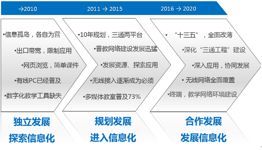 中国基础教育信息化开展,整体看来分为三个阶段,即:各校独立开展阶段、政府规划开展阶段和社会合作开展阶段。